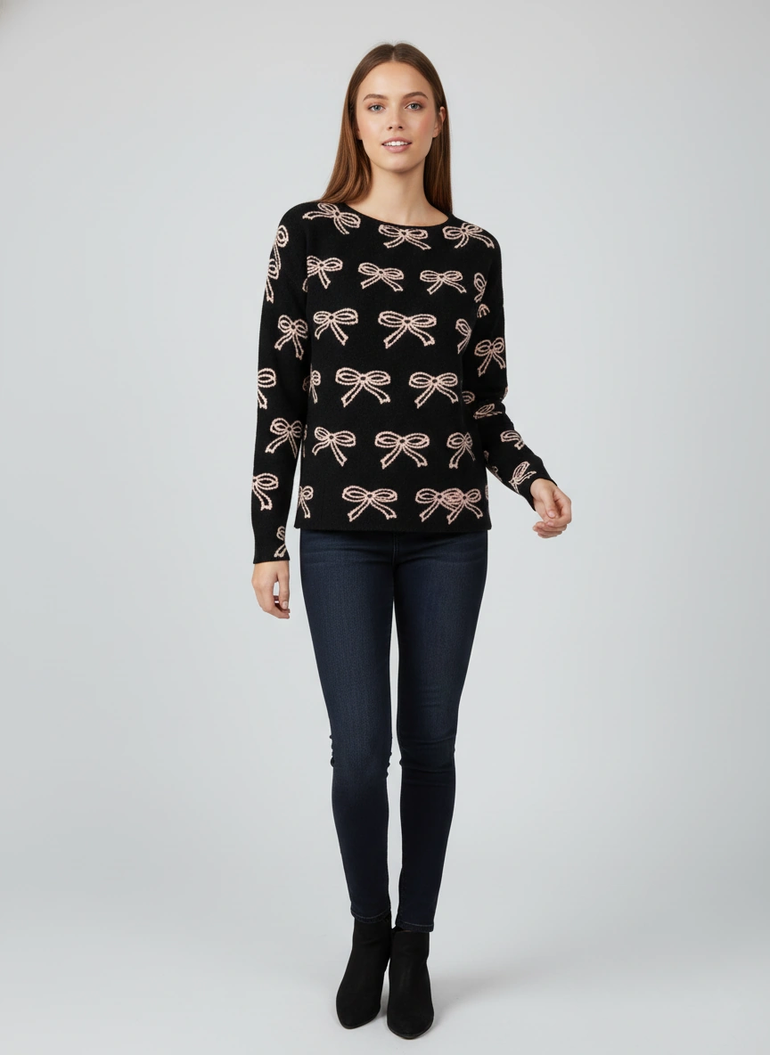 STYLE 900785, LADIES BOAT NECK PULLOVER WITH BOWS JACQUARD PATTERN in BLACK:IVORY