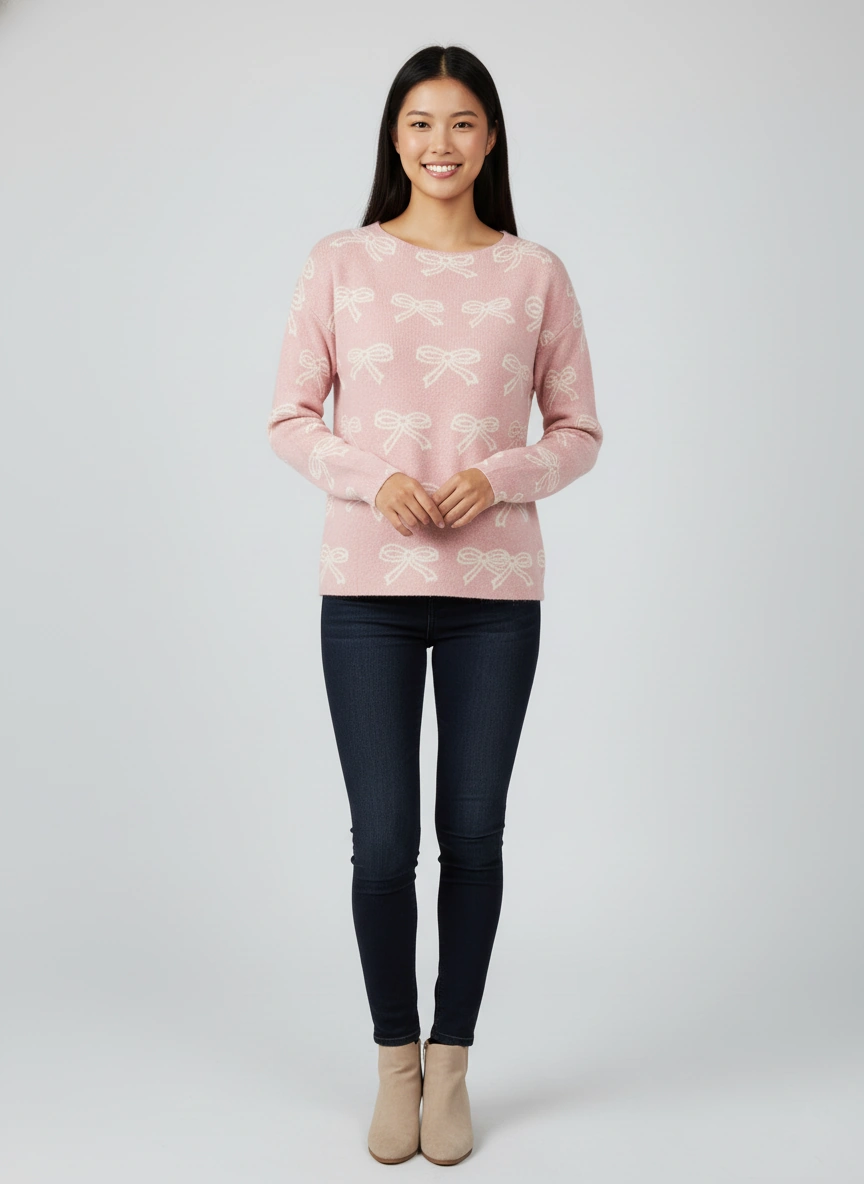 STYLE 900785, LADIES BOAT NECK PULLOVER WITH BOWS JACQUARD PATTERN in IVORY:PEACH